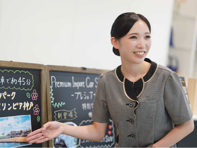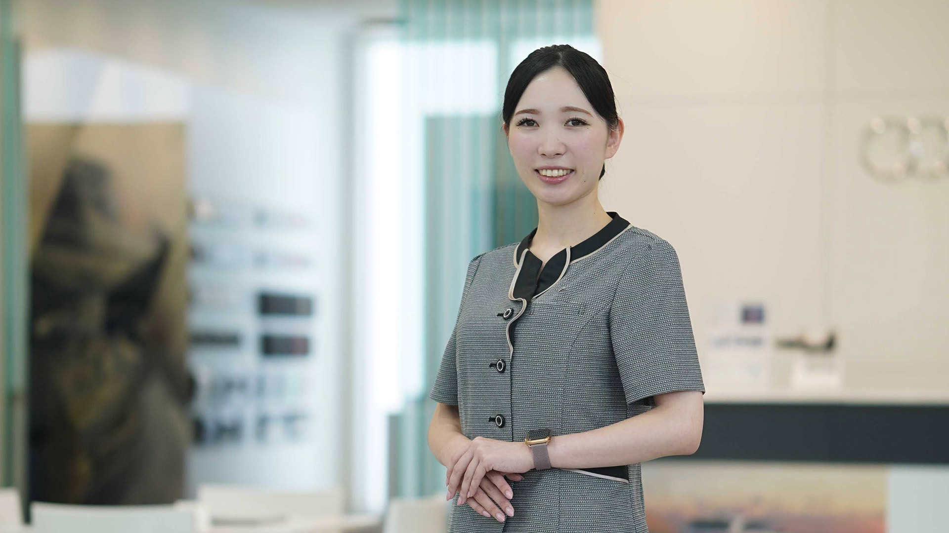 ご来店いただくお客様には居心地のよいショールームだと感じていただけるよう、 全員でいつでもパーソナルなお出迎えができる準備を整えます。 お車がエントランスに入って来られましたら誘導し、笑顔で歓迎の気持ちをお伝えする事を心掛け、ショールームでの待ち時間を楽しく、 快適にお過ごしいただけるよう茶菓サービスや雑誌のご提供、グッズ販売、場合によってはご試乗の提案なども行っています。 お茶菓子とドリンクは、季節感のあるフルーツやお客様にご興味をお持ちいただける旬な物を毎月カスタマーアシスタント同士で考え、見た目にも楽しんでいただけるように拘っておりますのでお喜び頂けるととても嬉しく感じます。 接客応対以外にも電話対応や事務業務も行います。 事務は主に登録業務、サービス業務、経理業務を分担しており、私は経理業務を担当しているため伝票処理や入出金管理、給与資料の作成、保険管理などを通して多方面から店舗運営に携わっております。 カスタマーアシスタントは、直接お車の販売に関わる仕事では無いかもしれませんが、セールスやサービス担当者とはまた違った存在としてお客様とお店を繋ぐ重要な役割があると考えています。 ショールームには年齢、家族構成、ご職業など様々なお客様がご来店されますので、そのお客様に合った応対を常に意識し、何より笑顔でご満足してお帰りいただくためにもお困りごとは無いか、 退屈されていないかを把握しスタッフ間で共有しておくことも重要です。 カスタマーアシスタントが先にお客様の状況に気付き、こちらからプラスワンのお声掛けができる様に日々心掛けております。